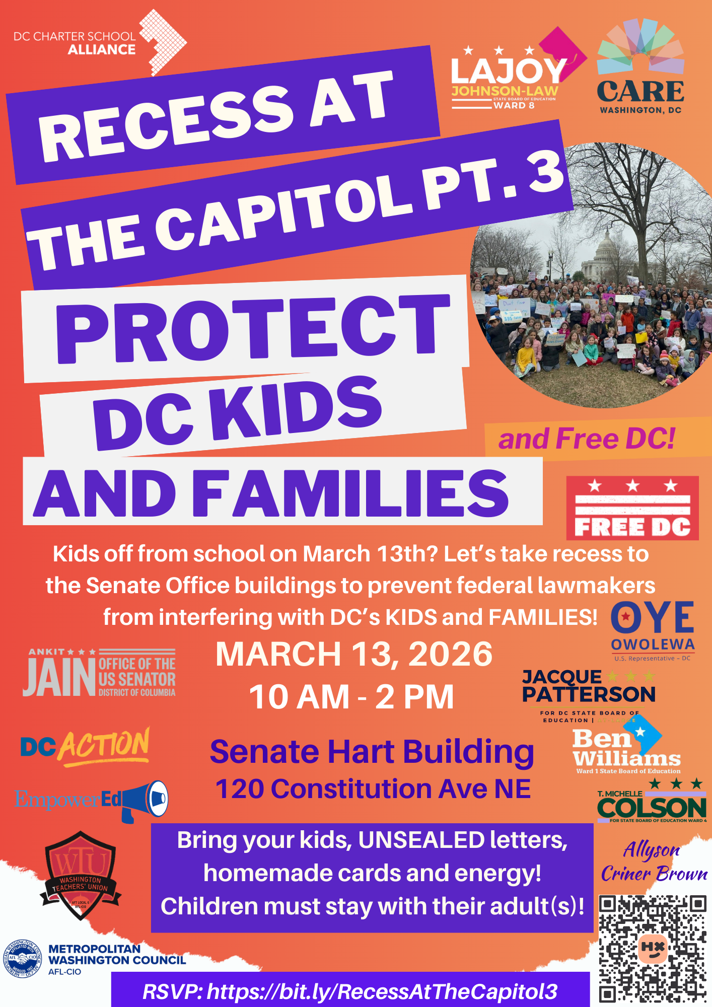 The Recess at the Capitol organizers thank WTU and its members for their strong support and participation in last year’s actions. This year’s event will take place on Friday, March 13 at the Senate Hart Building, a day that coincides with DCPS’s dedicated Wellness Day. WTU members are invited to join the action if they wish, while also being encouraged to use the day in whatever way best supports their own wellness.