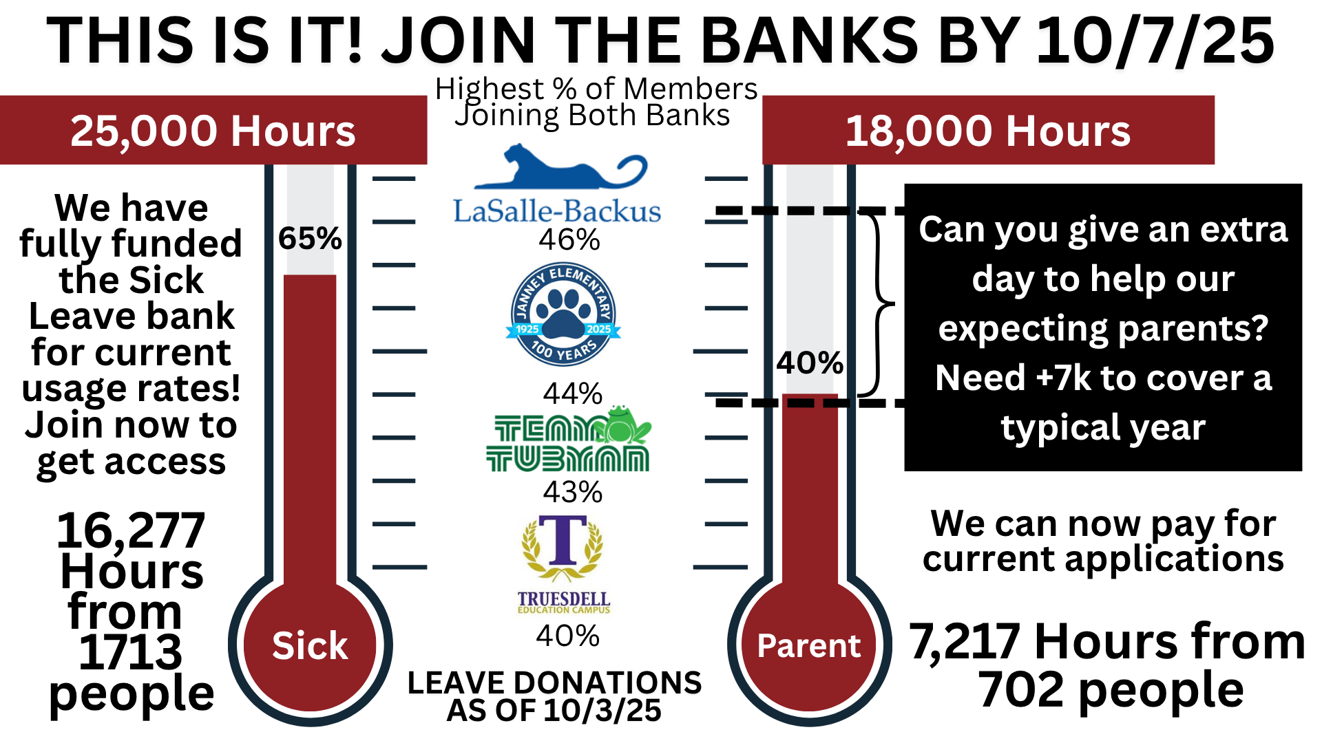 Thanks to 1,713 generous donors, we've reached 65% of our Sick Leave Bank goal—16,277 hours strong! But we still need 7,000 more hours to fully support expecting parents—watch the step-by-step video to learn how you can join the bank by October 7 and make a lasting impact.