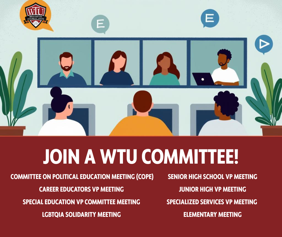 This month, we’re encouraging every member to take the next step by joining one of our WTU Committees. Whether you're passionate about professional learning, political action, community outreach, or contract enforcement, there’s a committee where your voice and leadership are needed.