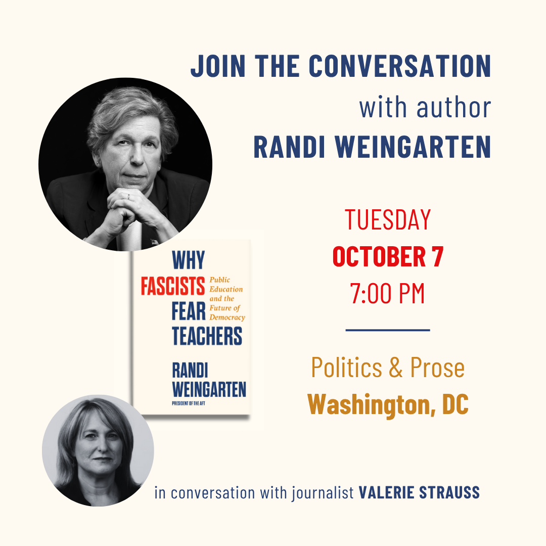 Join Randi Weingarten at Politics & Prose on Tuesday, October 7 at 7 PM for a powerful discussion on her new book Why Fascists Fear Teachers, in conversation with journalist Valerie Strauss. Don’t miss this chance to engage in the fight for public education and democracy.