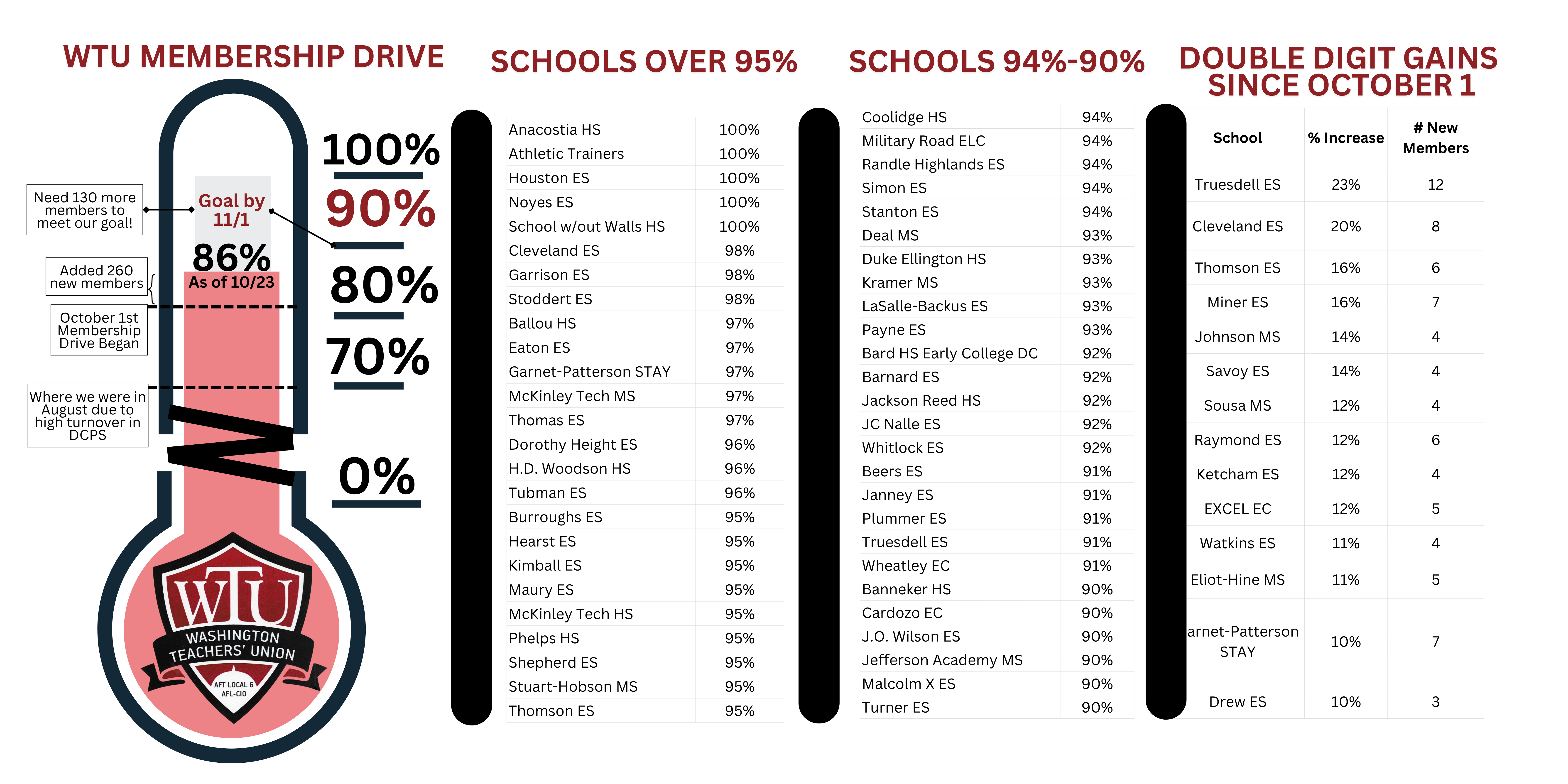 We’re in the home stretch of our October Membership Drive, and the momentum is incredible! As of October 23, we’ve reached 86% membership, with schools like Anacostia HS, Athletic Trainers, Houston ES, Noyes ES and School Without Walls leading the way at 100%. Many others are closing in fast, and schools such as Truesdell ES and Cleveland ES have posted double-digit gains since the start of the month. This progress shows what we can achieve together—but we’re not done yet.