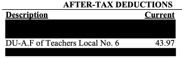 Check your paystub - "After-Tax Deduction" should see "DU-A.F. of Teachers Local No. 6" slated for $43.97 on 10/31 Paycheck. If you don't see it, you are not a member of the WTU.