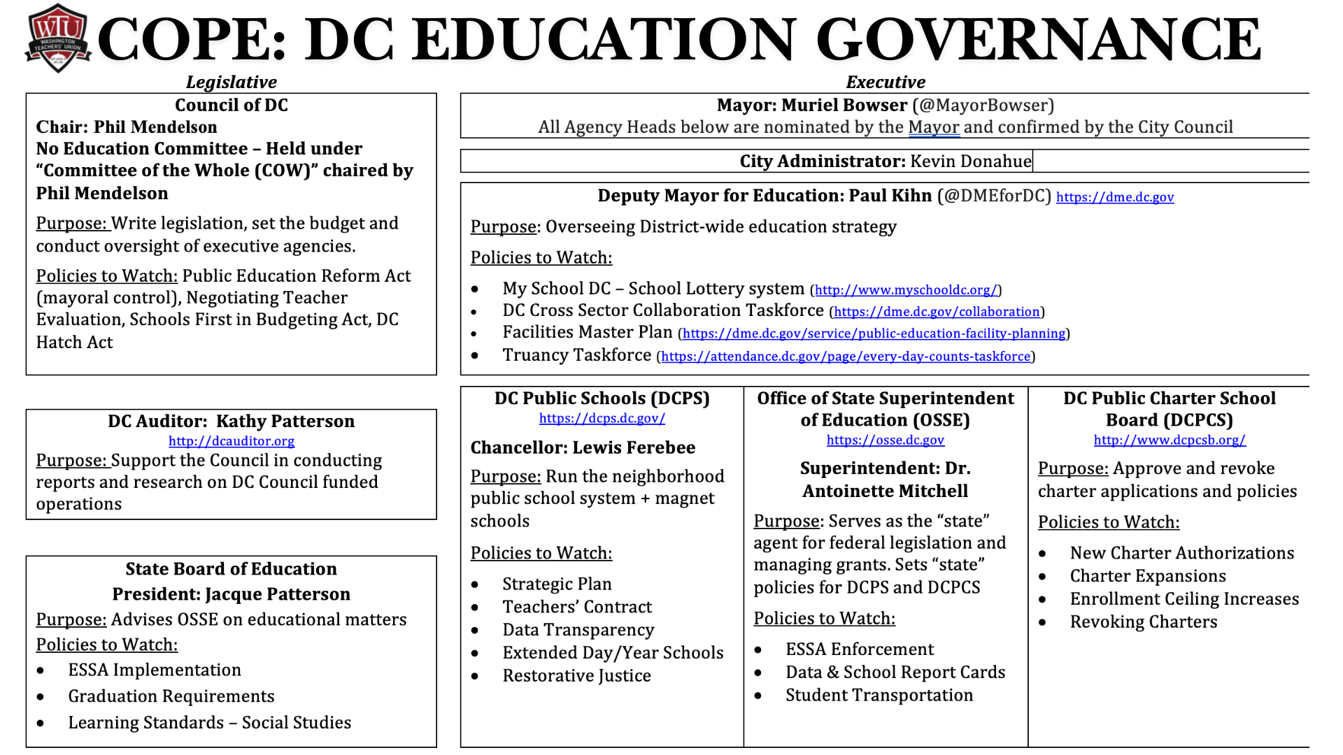 The DC Democratic Primary is the election where the future of DC Government is largely decided. Mayor Bowser, Brianne Nadeau and Anita Bonds have all announced they are not running again. The WTU Committee on Political Education (COPE) has begun an expedited process for Ward 1 DC Council and Mayoral Election, sending out our questionnaire to all candidates and will be hosting a candidate forum on January 7th from 6-8PM. We will then follow with the rest of the DC Council, Attorney General and DC Delegate to Congress in the following months.