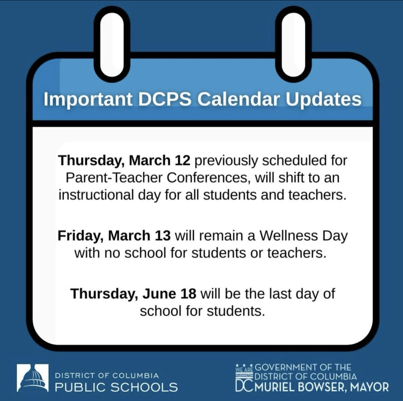 DCPS has adjusted the 2025–26 school calendar in response to the recent winter storm, adding an instructional day on March 12 and extending the last day for educators to Monday June 22 to make up for weather‑related closures.